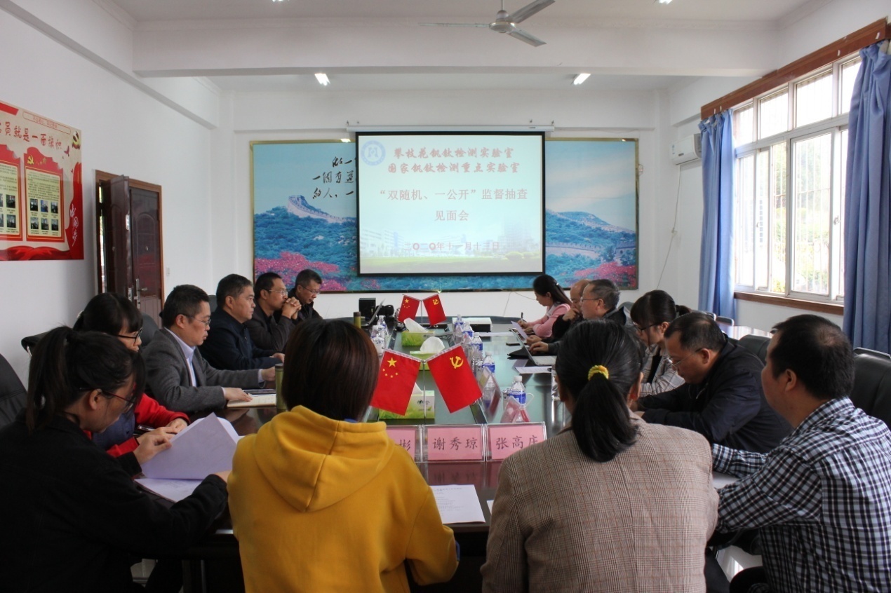 2020年11月13日上午,由四川省市场监督管理局认证认可与检验检测监督管理处(以下简称省监管局监督处)对攀枝花钒钛检测实验室进行“双随机、一公开”监督抽查工作正式启动,此次监督抽查工作持续两天。见面会由省监管局监管处委派的专家组组长王进宇主持,在攀枝花学院钒钛学院一楼会议室召开。
